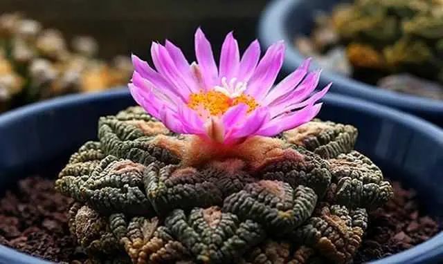 同樣原產(chan) 於(yu) 墨西哥和美國得克薩斯州的仙人掌科植物“大統領”,植株則呈球形或筒狀,疣狀突起明顯,革紫色的花朵直徑可達5至6厘米,非常美麗(li) ,也是仙人掌科中可供盆栽觀賞的佼佼者。