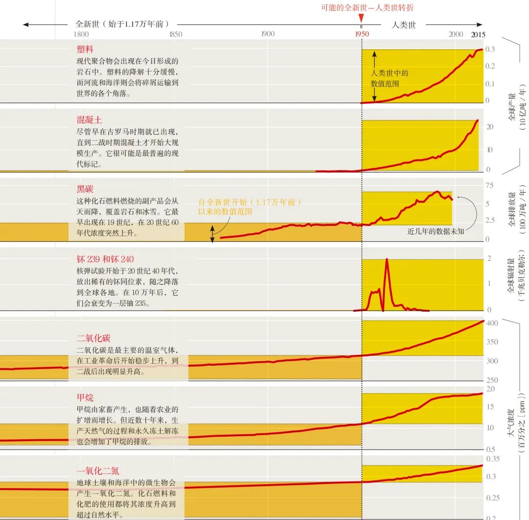 過去的一個(ge) 世紀中,化石燃料的廣泛使用使得鋁、塑料和混凝土的生產(chan) 越來越迅速,沉積的量也變得越來越大。這個(ge) 過程也產(chan) 生了一些副產(chan) 品,由於(yu) 大量燃燒化石,全球範圍內(nei) 的沉積物中也留下了各種各樣的化學印記。工業(ye) 革命開始以來,大氣中二氧化碳含量升高的速率已超過全新世初期冰川退縮時的水平(當時排放的氣體(ti) 以小氣泡的形式被捕獲並保留在極地冰蓋的冰層中)。
