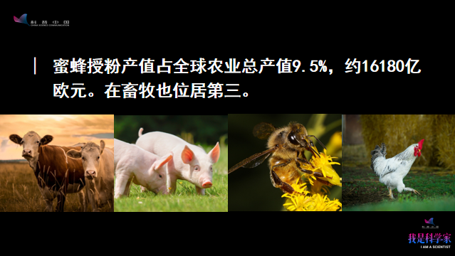 這是歐洲的畜牧業(ye) 的結構——牛排第一,豬是第二,蜂是第三,雞是第四。然而在我們(men) 國家,蜜蜂排不上號,因為(wei) 我們(men) 政府隻統計生產(chan) 蜂蜜的直接貢獻,把蜜蜂授粉這一大於(yu) 蜂產(chan) 品本身價(jia) 值100倍以上的產(chan) 值沒有考慮。所以愛因斯坦說當蜜蜂從(cong) 地球上消失的時候,人類最多隻能生存4年,為(wei) 什麽(me) ?因為(wei) 沒有蜜蜂,就沒有授粉,繼而沒有可食的植物和動物,也就沒有人類。