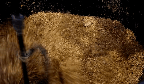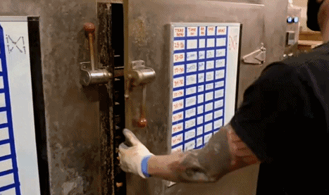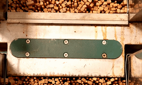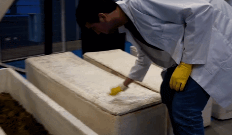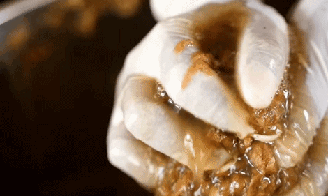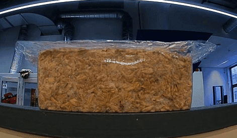 消毒過後,它們(men) 會(hui) 以約560克為(wei) 一組進入大型液壓機,壓成筷子蛋糕定型,看起來有點兒(er) 像薩其馬。