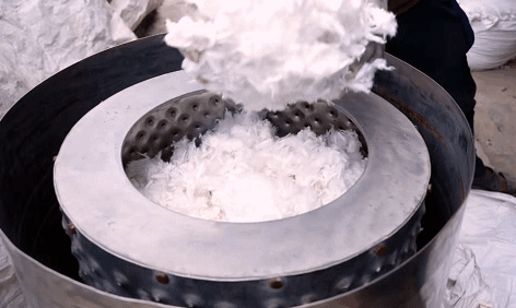 洗到雪白的棉花會(hui) 在這裏統一甩幹,再用專(zhuan) 門的機器彈至蓬鬆。