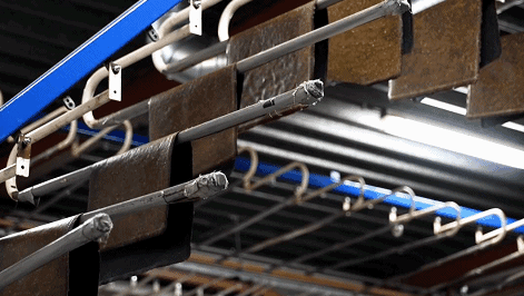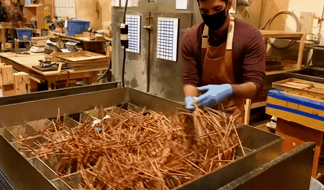 清理分類好的筷子會(hui) 放在一個(ge) 金屬籠子裏,用一種水性樹脂充分浸泡。