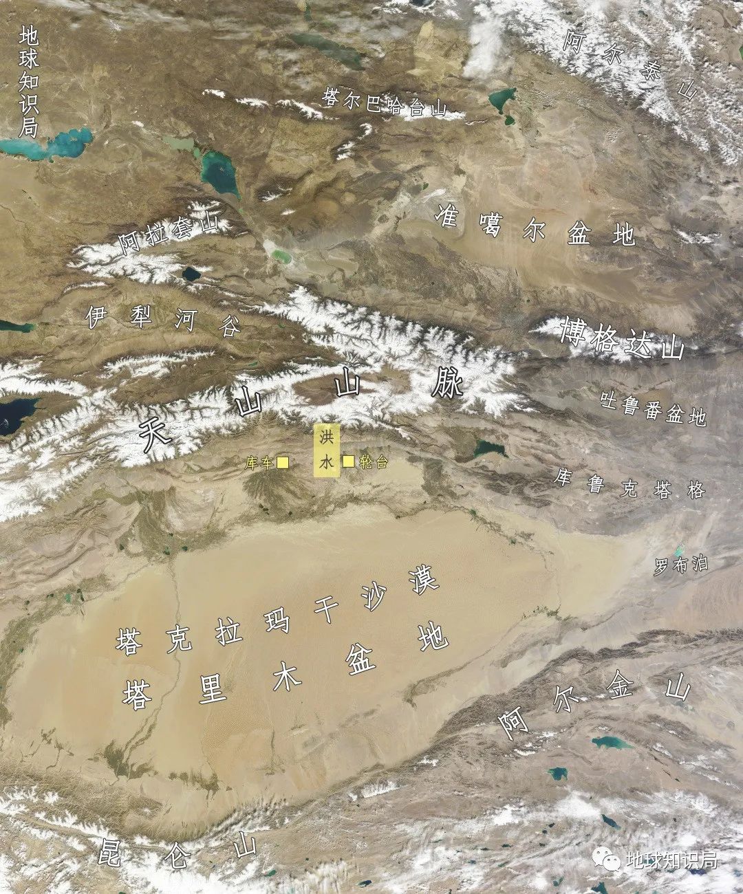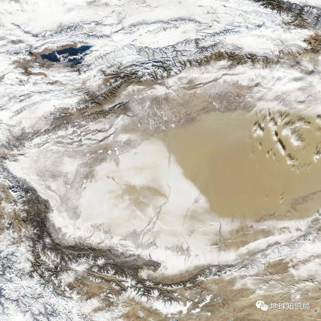 白雪皚皚的天山山脈與(yu) 南邊的沙漠形成了鮮明對比
