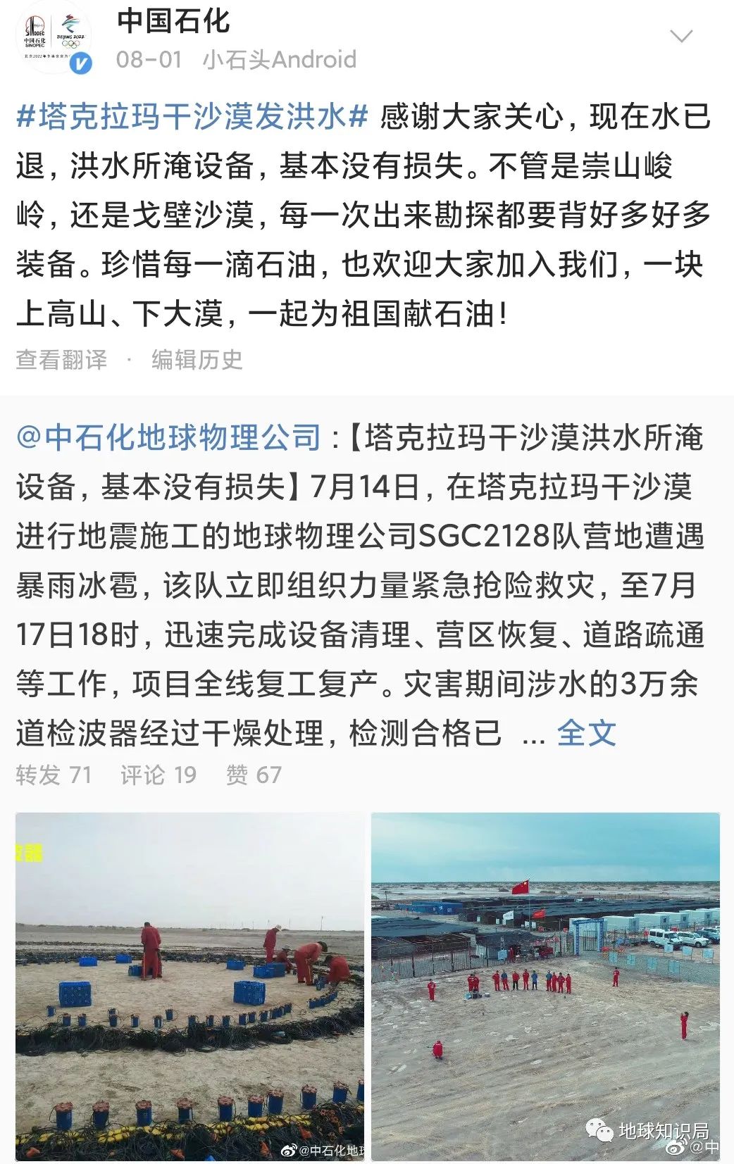 此次塔克拉瑪幹沙漠北緣發生洪水的主要原因,是天山南坡迪娜爾山二八台河上遊山區發生了較強降雨,形成了小流域洪水。至於(yu) 在當地作業(ye) 的中石化,沒有像網上說的那般損失巨大。實際上,石油部門包括地勘部門的損失有限,泡水的車輛和設備浸水時間不長,基本不影響使用。