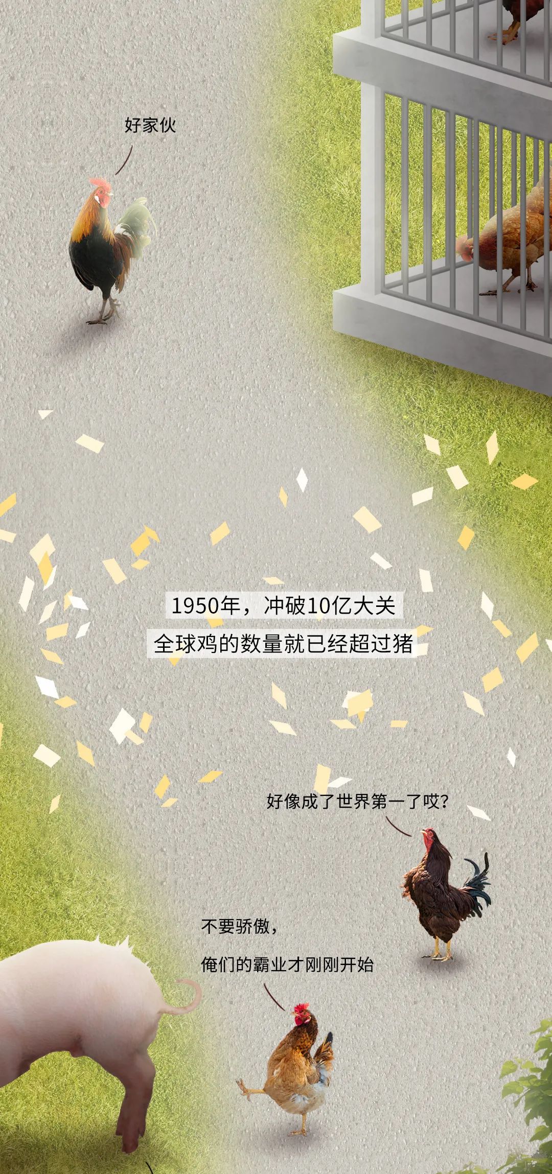 ◆雞能風靡全球的真正原因是料肉比高,雞每吃2公斤就能增重1公斤,而豬需要3公斤,牛甚至需要7公斤。雖然魚類料肉比更高,但卻沒有養(yang) 雞更適合集約化、機械化養(yang) 殖。