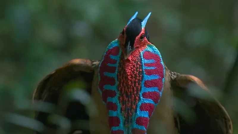 黃腹角雉雄鳥求偶時,喉下的肉裙膨脹下垂,顯現鮮豔的朱紅色,翠藍色的條紋縱橫交錯。深圳視界紀錄拍攝
