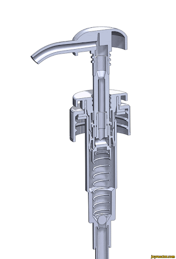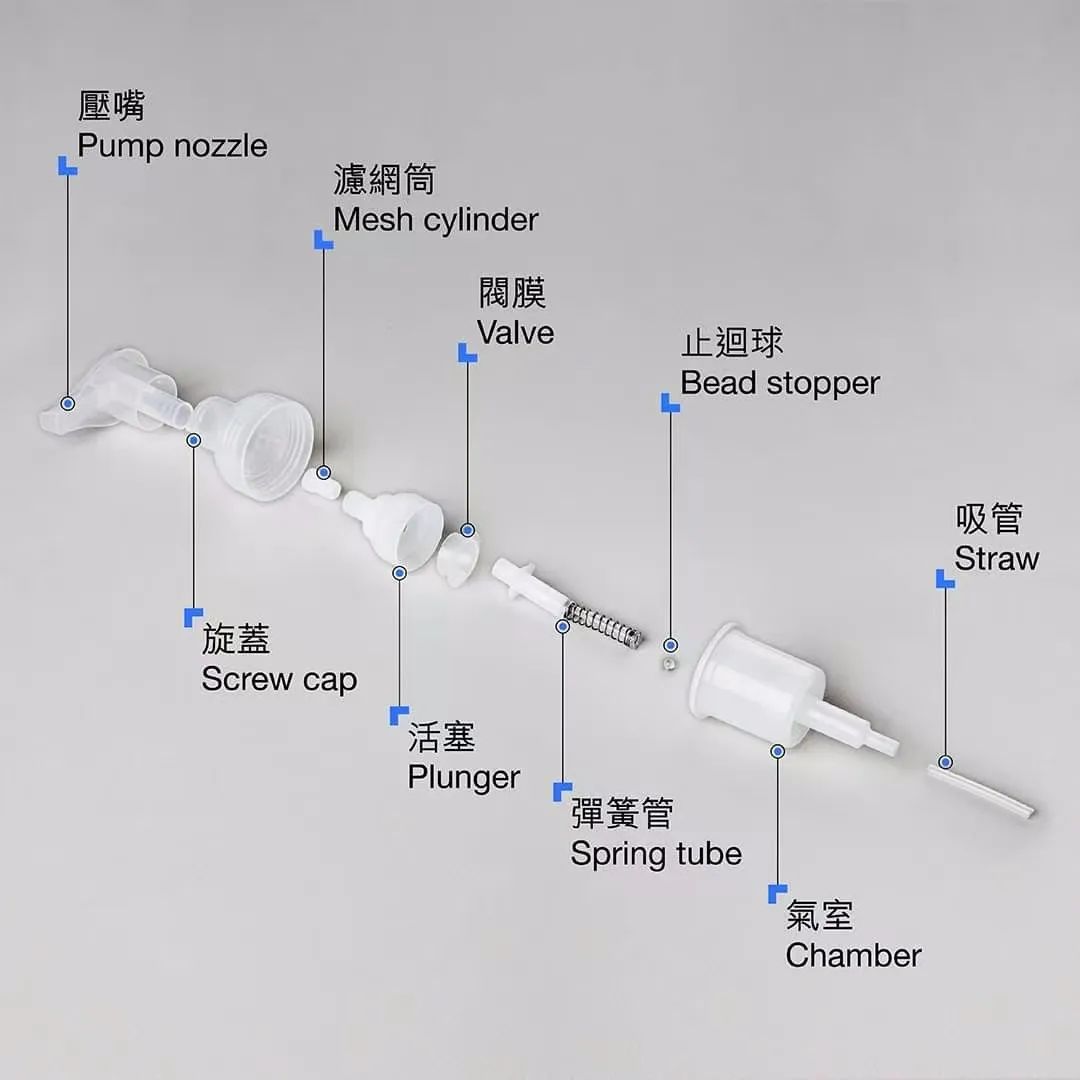 洗手液在瓶子裏明明還是液態,一擠出來就變成了泡沫。這種近年流行開來的起泡瓶結構並不複雜,隻是在原來的按壓式吸液泵的基礎上加上了起泡結構。 當我們(men) 按下普通洗手液瓶上的泵頭時,泵內(nei) 的活塞下壓,同時向下的閥門(彈簧下的小珠子)關(guan) 閉,其中的空氣被迫向上排出去。