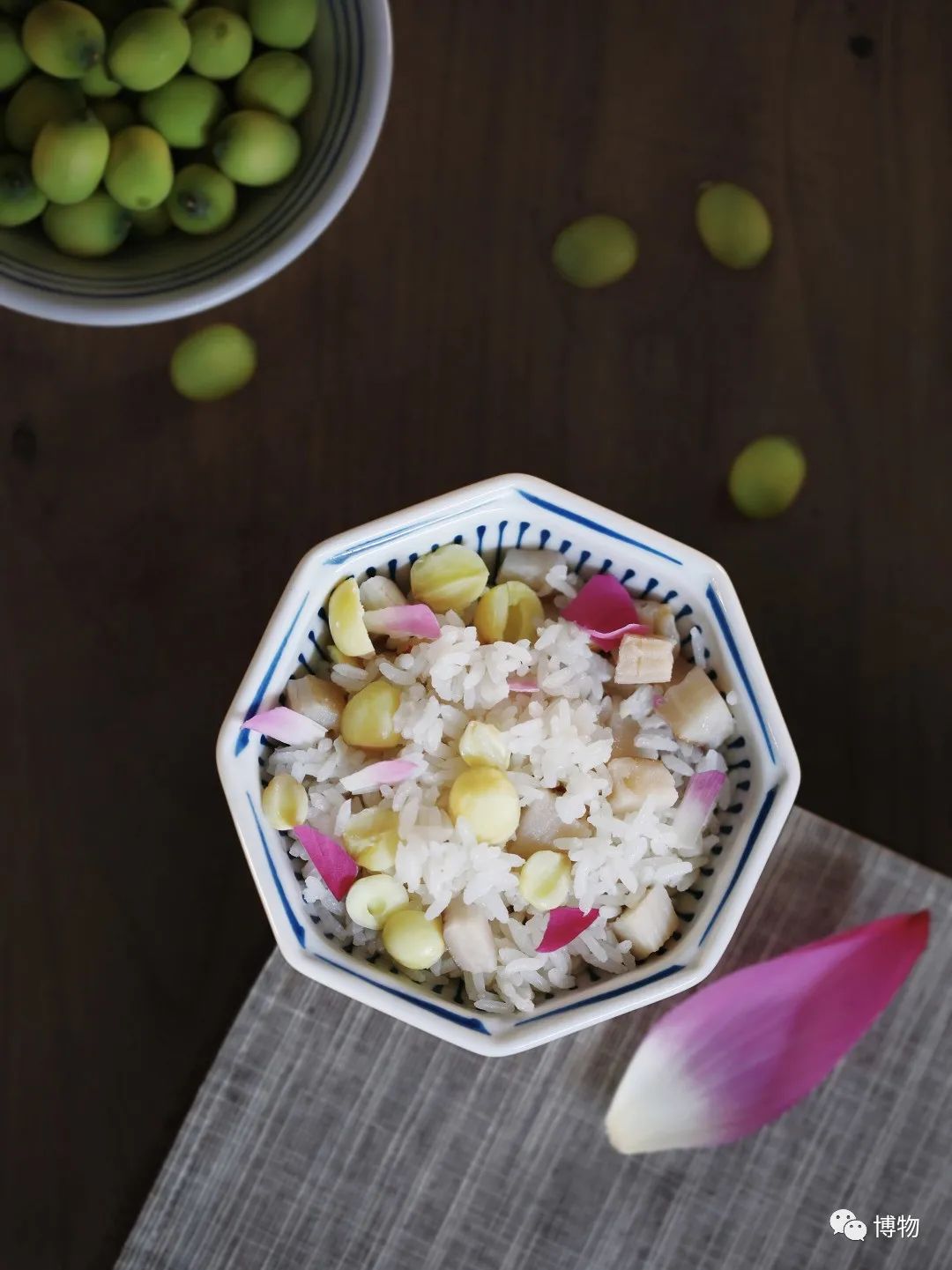 宋人林洪在《山家清供》中記錄的“玉井飯”,是一種秋季風味的加料飯,用藕塊、蓮子與(yu) 米同煮而成,取“太華峰頭玉井蓮,開花十丈藕如船”的詩意。拍攝:唐誌遠