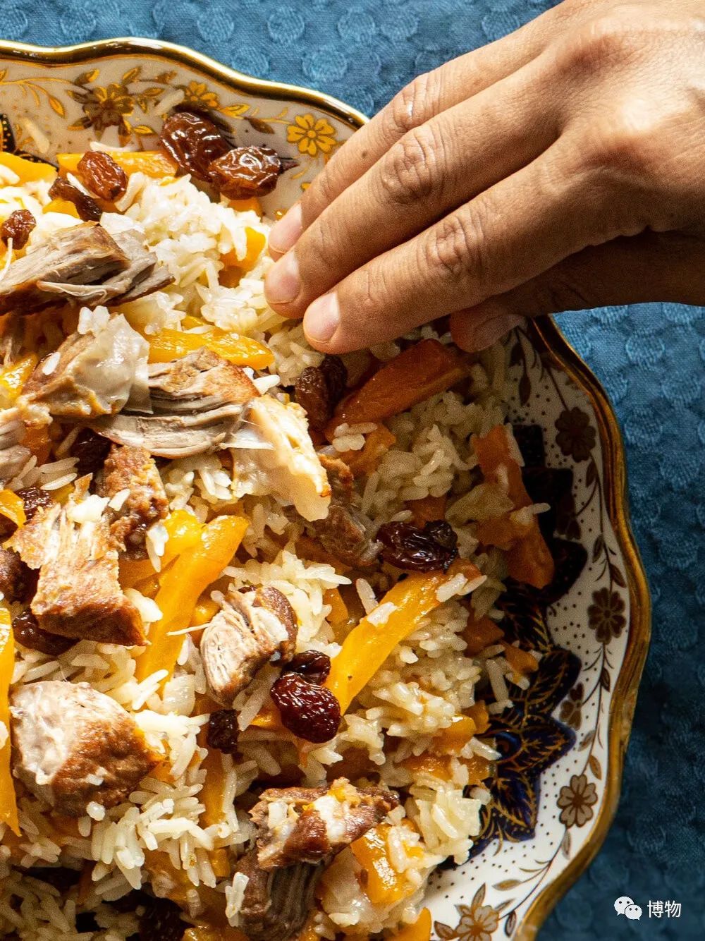 這樣製作出來的抓飯滋味格外豐(feng) 富,米飯粒粒分明,羊肉帶來鹹鮮滋味,燜得軟爛的胡蘿卜幾乎化在飯中,最後還帶有一點葡萄幹的甜蜜。