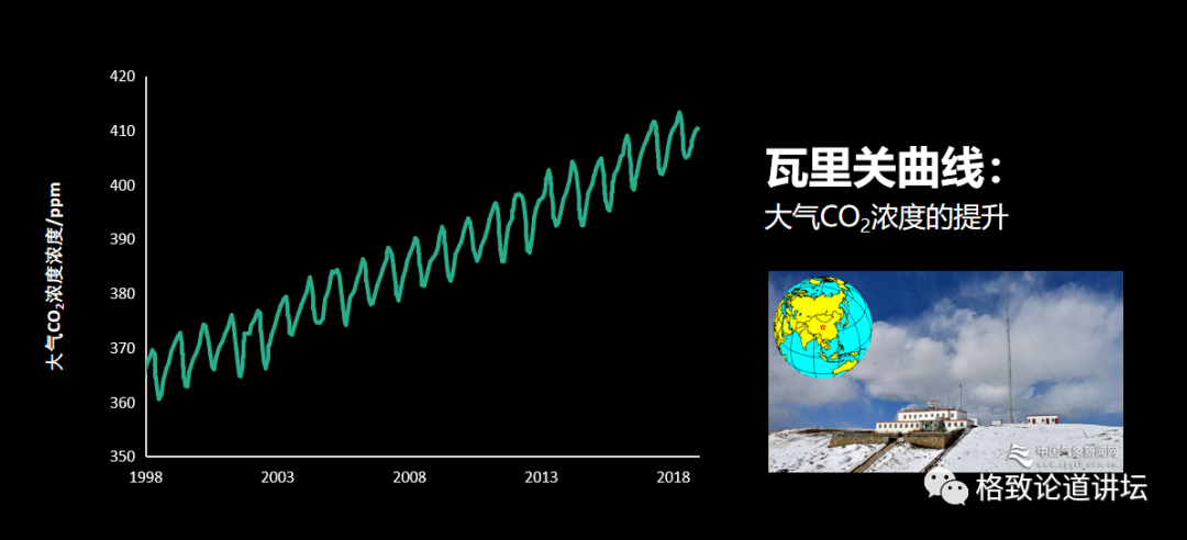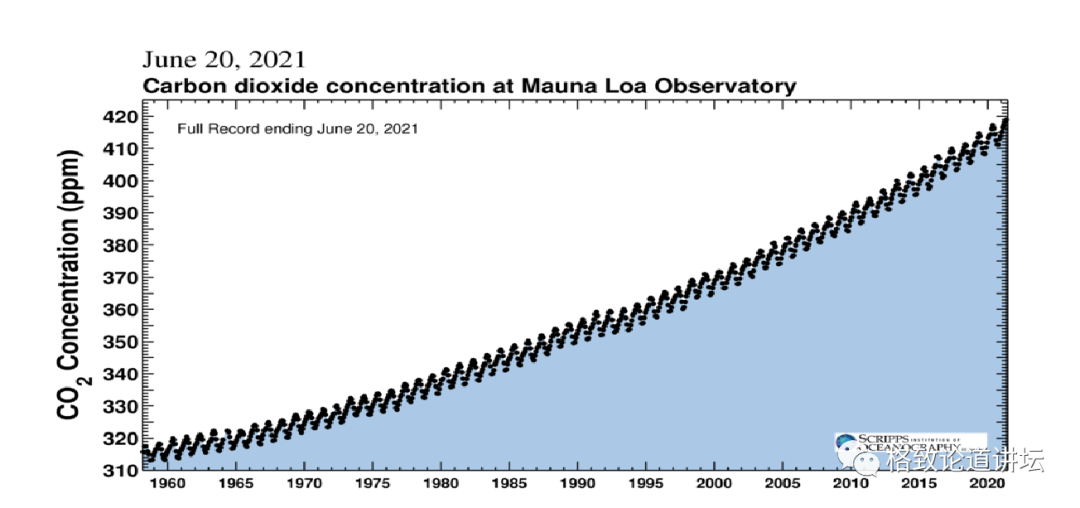 這張圖是在美國夏威夷的一個(ge) 島上監測到的大氣二氧化碳變化曲線——基林曲線,這是基林博士在1958年的時候首次監測到的。其實他當時並沒有在監測二氧化碳,但他發現有這樣的變化後,就一直堅持觀測,到現在已經有62年的數據了。我們(men) 認為(wei) 基林曲線是20世紀最偉(wei) 大的科學發現之一。