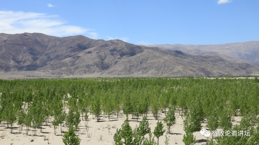 人類活動對青藏高原碳庫的增加和變綠是非常重要的。這張照片展示的是西藏的雅魯藏布江河穀人工林,實際上是在治沙。大家早些年去西藏的時候可能會(hui) 遇到飛機到了拉薩上空因為(wei) 風沙返航,但是近些年很少有飛機返航了。以前一年大概有80多天會(hui) 有飛機返航,現在可能不到30天。人工林在造林、固沙的同時保證了航班的安全穩定,另外也是很重要的碳庫。從(cong) 2000年以來,造林使得西藏的森林碳庫增加了21%,將近四分之一,這很了不得。