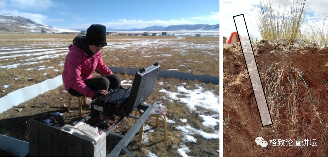除了監測量以外,我們(men) 還需要進一步監測根係的生長。左圖是我帶的研究生,在冬天還在無人區裏監測根係的生長。我們(men) 用微根窗來看根係的生長過程,因為(wei) 隻有了解了根係的生長過程,才知道碳變化的機理在哪裏。