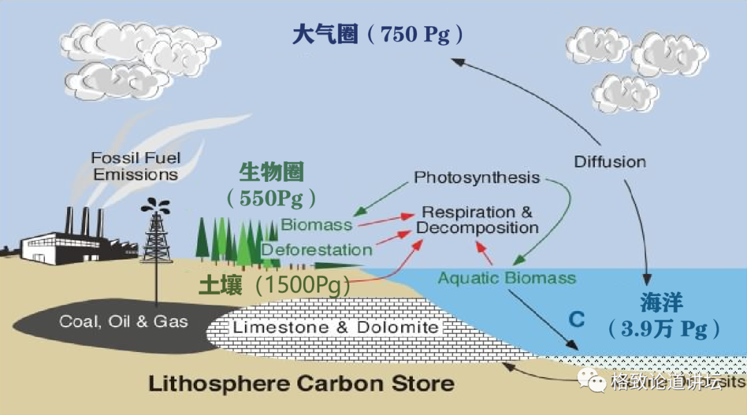 這張圖顯示了地球幾大圈層的碳庫。實際上,岩石圈占了碳庫的大部分,達到90%以上。但它相對比較穩定,大家關(guan) 注得很少。另一個(ge) 主要的庫就是海洋,海洋庫的儲(chu) 存量大概是3.9萬(wan) Pg,1Pg相當於(yu) 10億(yi) 噸。大氣圈的儲(chu) 存量是750Pg。