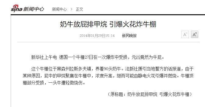 不過即使心態放得開,動物過多放屁也不一定是個(ge) 好事。在2014年初,德國的一個(ge) 牛棚裏就出過這麽(me) 一檔子事。