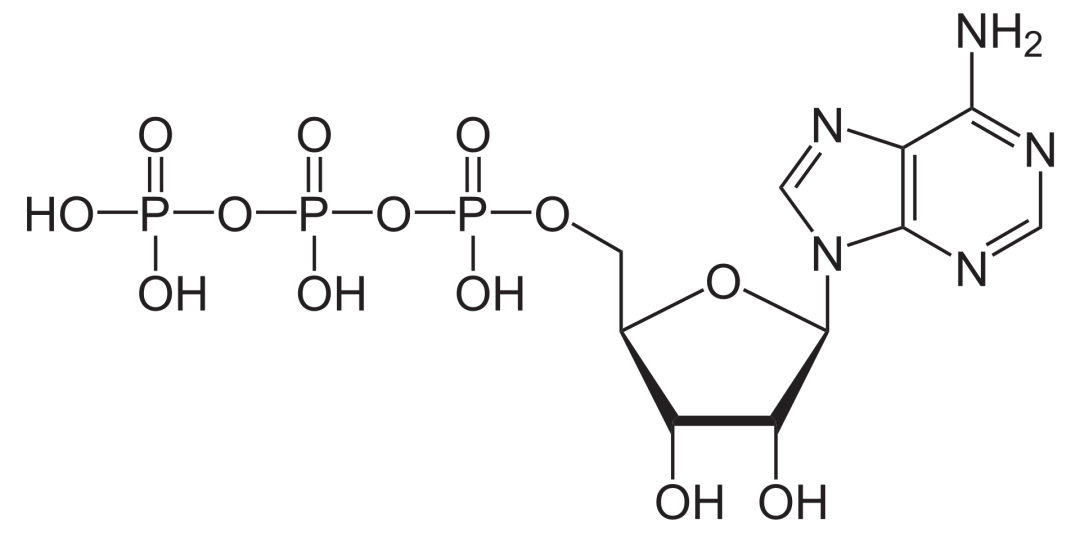 ATP分子結構,包含3個(ge) 磷酸基團(左側(ce) ),水解釋放能量 | 圖源:Wikipedia