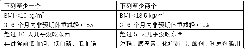 另外,低鉀血症、低鎂血症也是可能出現的並發症。缺少鉀、鎂等電解質會(hui) 擾亂(luan) 細胞的膜電位,也會(hui) 擾亂(luan) 其他需要這些元素參與(yu) 的生理過程,引起抽搐、心律失常、呼吸抑製甚至心搏停止。 維生素B1則是人體(ti) 代謝糖類的關(guan) 鍵輔酶。少了它,會(hui) 讓人患上韋尼克腦病(Wernicke’s encephalopathy),表現出體(ti) 溫過低、精神錯亂(luan) 、昏迷等症狀。還可能引發科爾薩科夫綜合征(Korsakoff's syndrome),又稱健忘綜合征。 大量分泌的胰島素除了幹擾糖代謝,還有抗利尿效果,讓腎髒減少排出鈉和水。這會(hui) 導致各器官包括肺部開始水腫。心髒也會(hui) 充血過載,最終因為(wei) 不堪重負而心力衰竭。 再喂養(yang) 綜合征的這些症狀通常不會(hui) 在饑餓者飽食之後立即發生,而是在2~5天內(nei) 發病,嚴(yan) 重的可危及生命。 為(wei) 了預防和治療再喂養(yang) 綜合征的這些症狀,醫學界出了一套NICE(National Institute for Health and Care Excellence)指導規範。根據NICE,滿足以下這些條件(左列或右列)的人都屬於(yu) 高危者。