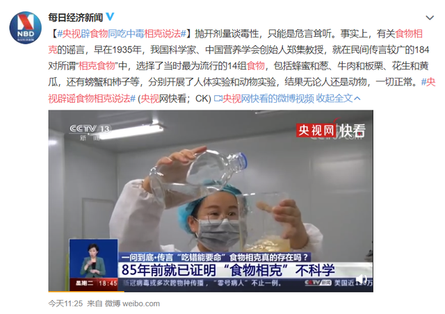 央視新聞關(guan) 於(yu) “食物相克”的辟謠報道其實,關(guan) 於(yu) “食物相克”的話題,主流媒體(ti) 早已進行過多次的報道和辟謠。如果簡單粗暴地回答這個(ge) 問題,那麽(me) 答案是“非也非也”。個(ge) 中邏輯其實很簡單——因為(wei) 食物的成分複雜多變,理論上,可以互相組合發生的反應也有無數種,“生成有害成分”便存在了許多可能,這或許也是各種“食物相克”的傳(chuan) 說層出不窮的源頭。但是,如果這些“禁忌傳(chuan) 說”都成立,我們(men) 能夠平安活到老真是不容易——對於(yu) 大多數人來說,既記不住那些禁忌,也不可能每日裏攥著長長的“禁忌名單”進餐。