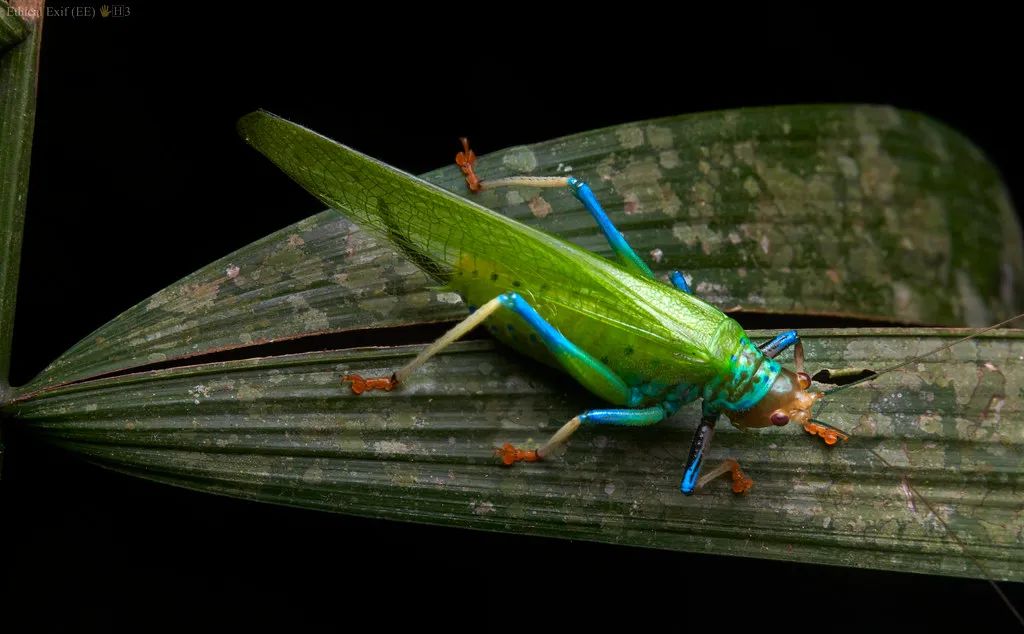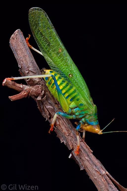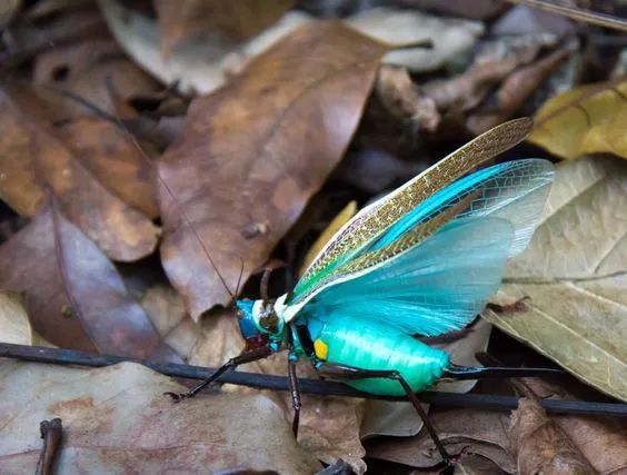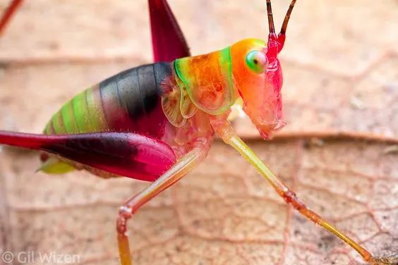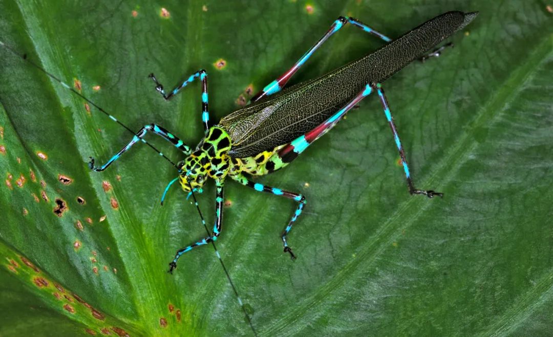 生活在中美洲和南美洲低地森林的虹螽屬Vestria 螽斯,有一個(ge) 好聽的名字——彩虹螽斯(Rainbow katydid ),瞧瞧,你有沒有被它們(men) 大膽且豔麗(li) 的配色驚豔到呢?