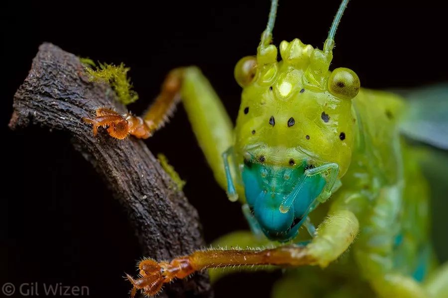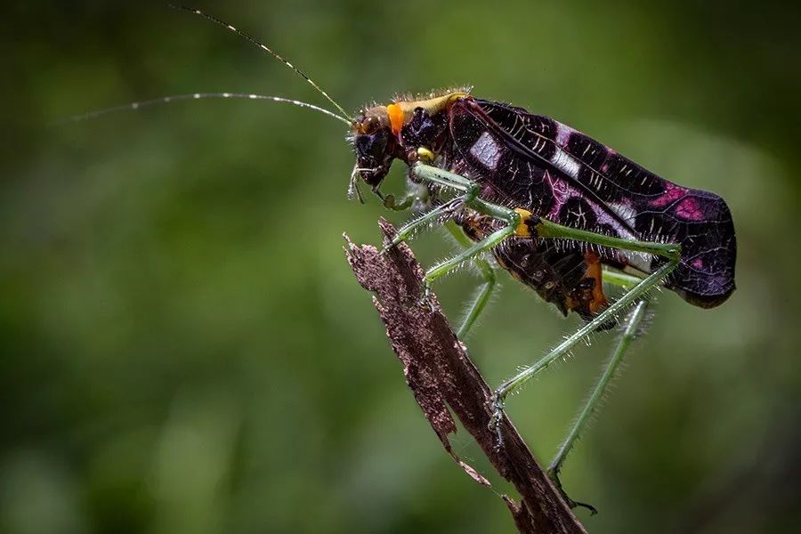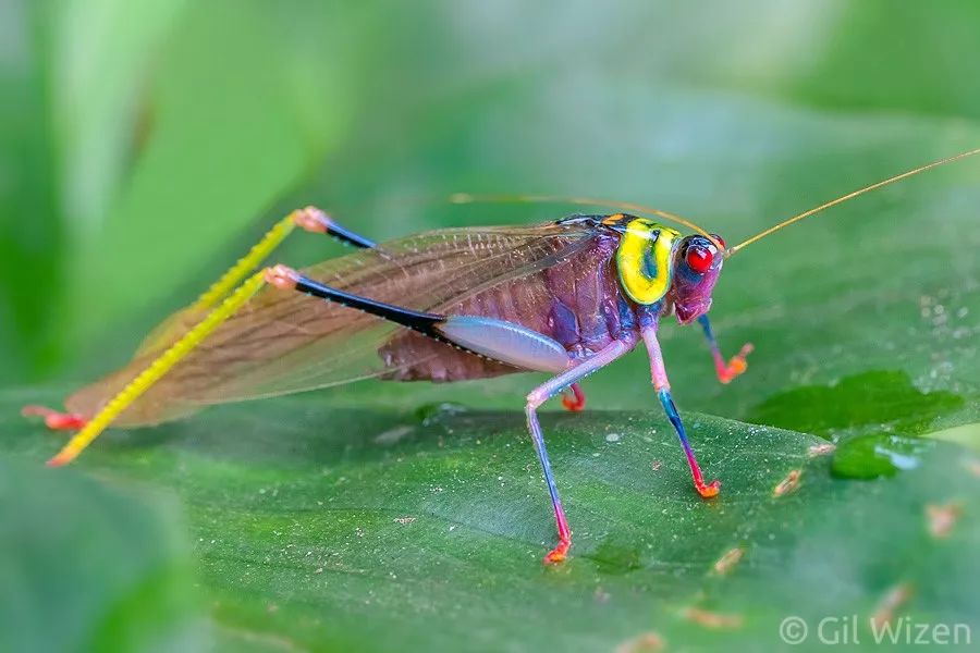 哥斯達黎加的彩虹須螽Euceraia insignis也十分好看,瞧它紅色的複眼、黃色的前胸背板和五彩的六足,給人一種小清新的感覺。