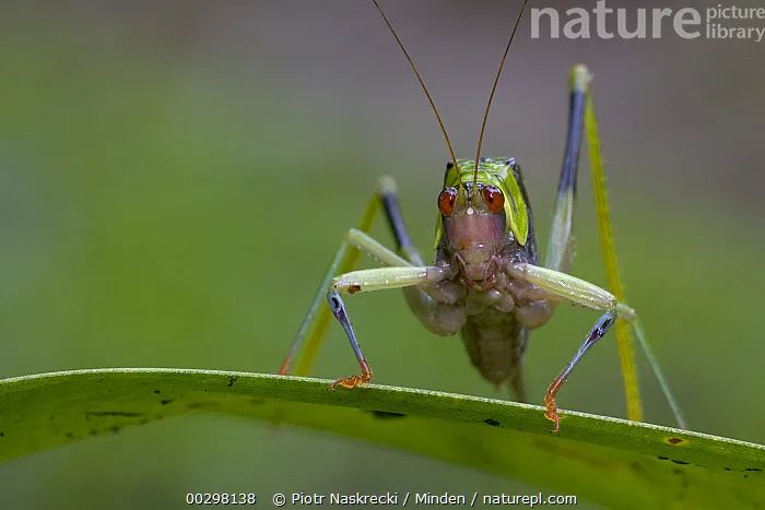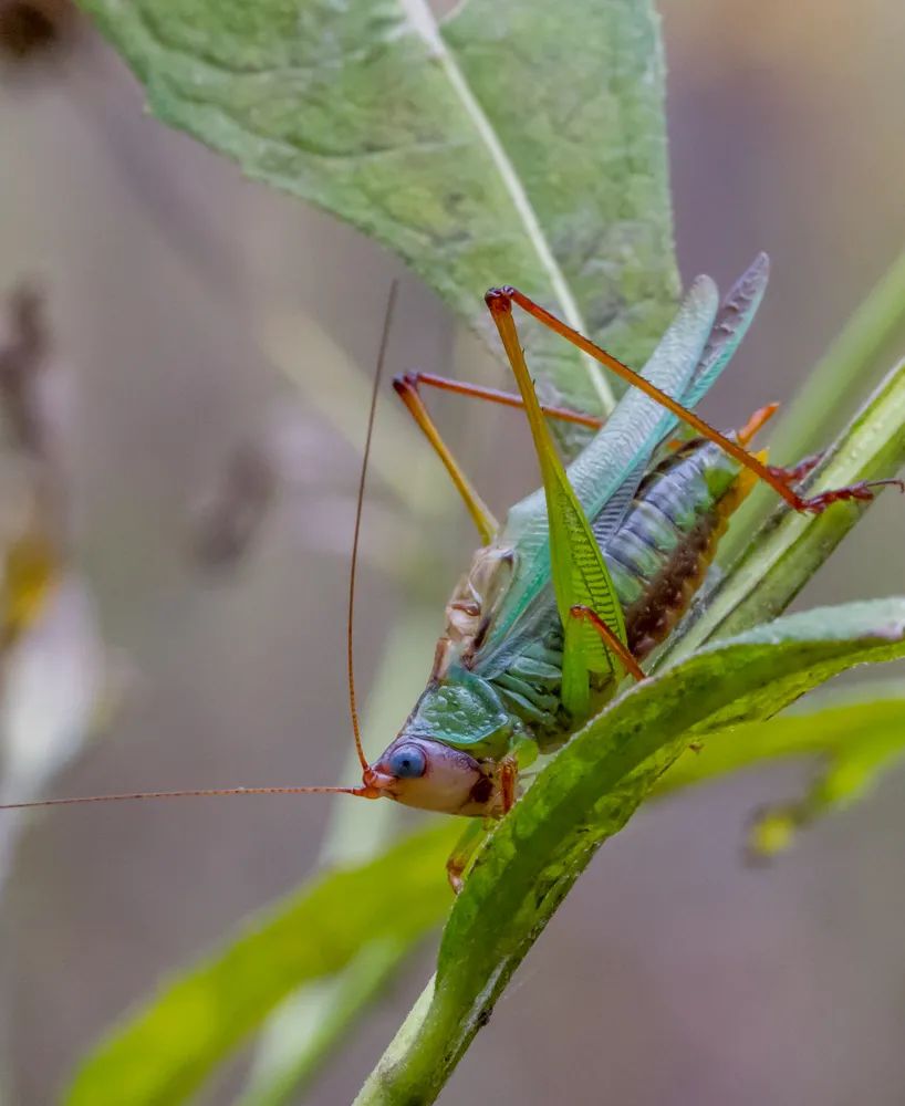 長角螽屬Orchelimum的螽斯主要分布在北美部分地區,常生活在田野或草叢(cong) 中,瞧它綠色、褐色和藍色的混色搭配,估計對於(yu) 時尚穿搭頗有心得。