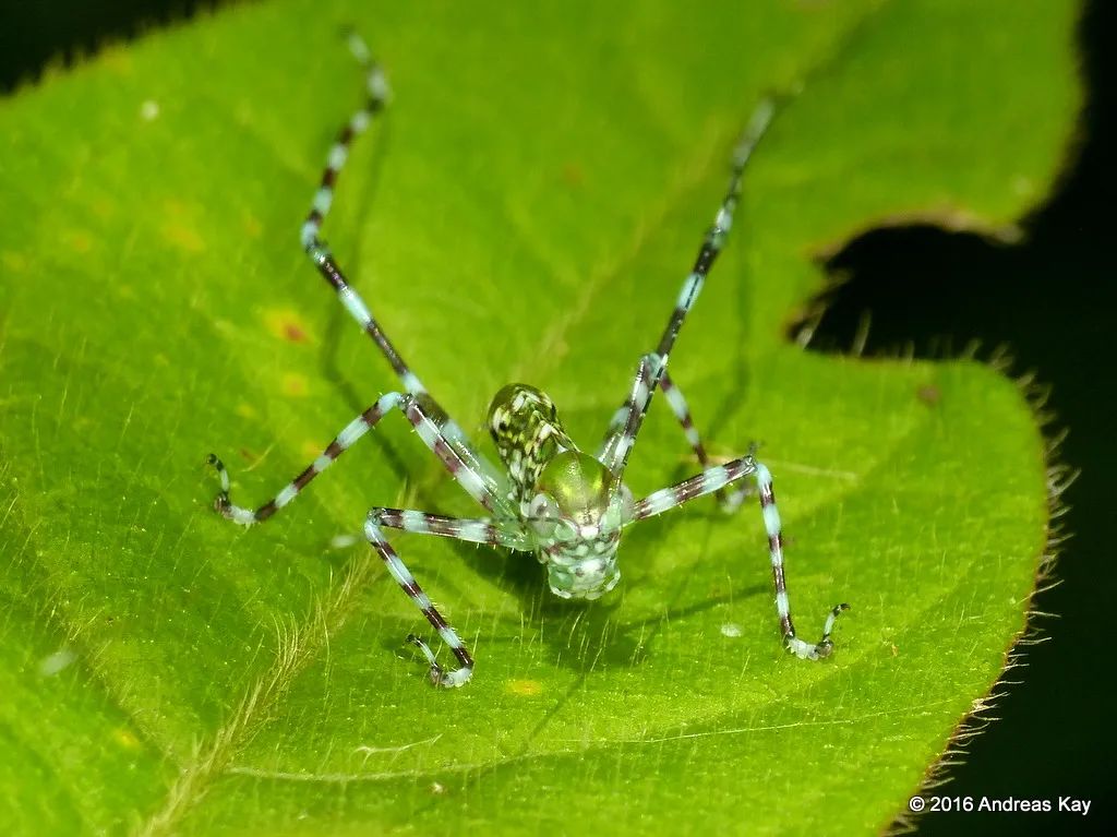 環足螽屬的大眼萌小家夥(huo) Harroweria sp.,若蟲藍黑相間的斑紋再加上超長的後足,遠遠看去似乎和蜘蛛有些相像。