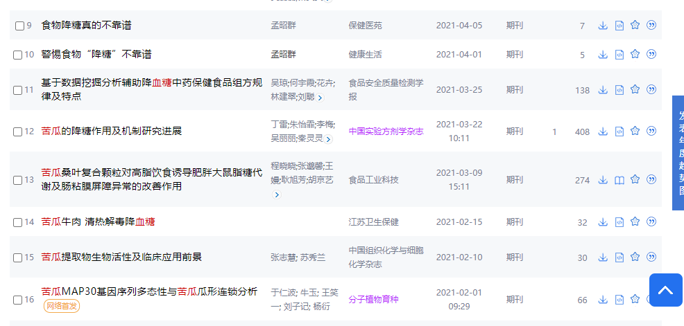 苦瓜苦瓜,真是味如其名,吃起來挺苦的,吃著確實能讓口腔中的甜味消失,那它有沒有降低血糖的作用呢?從(cong) 知網搜索文獻發現,確實有不少關(guan) 於(yu) 苦瓜降低血糖的研究。圖片來源中國知網