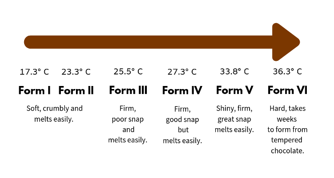 根據研究,可可脂一共有六種結晶狀態,每種不同的結晶分子排列方式不同,也都有著不同的熔點:I型晶體(ti) 17℃開始熔化,II型晶體(ti) 23℃開始熔化,III型晶體(ti) 25℃開始熔化,IV型晶體(ti) 27℃開始熔化,V型晶體(ti) 33℃開始熔化,VI型晶體(ti) 36℃開始熔化。