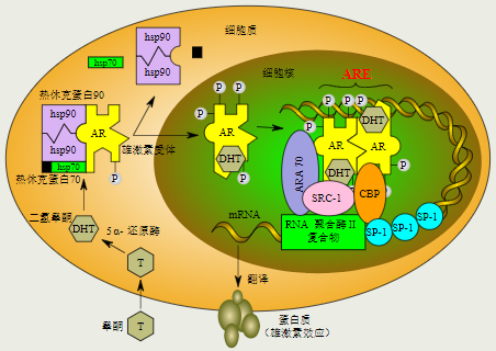 二氫睾酮與(yu) 雄激素受體(ti) 結合,改變細胞功能的示意圖