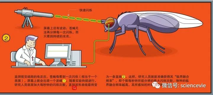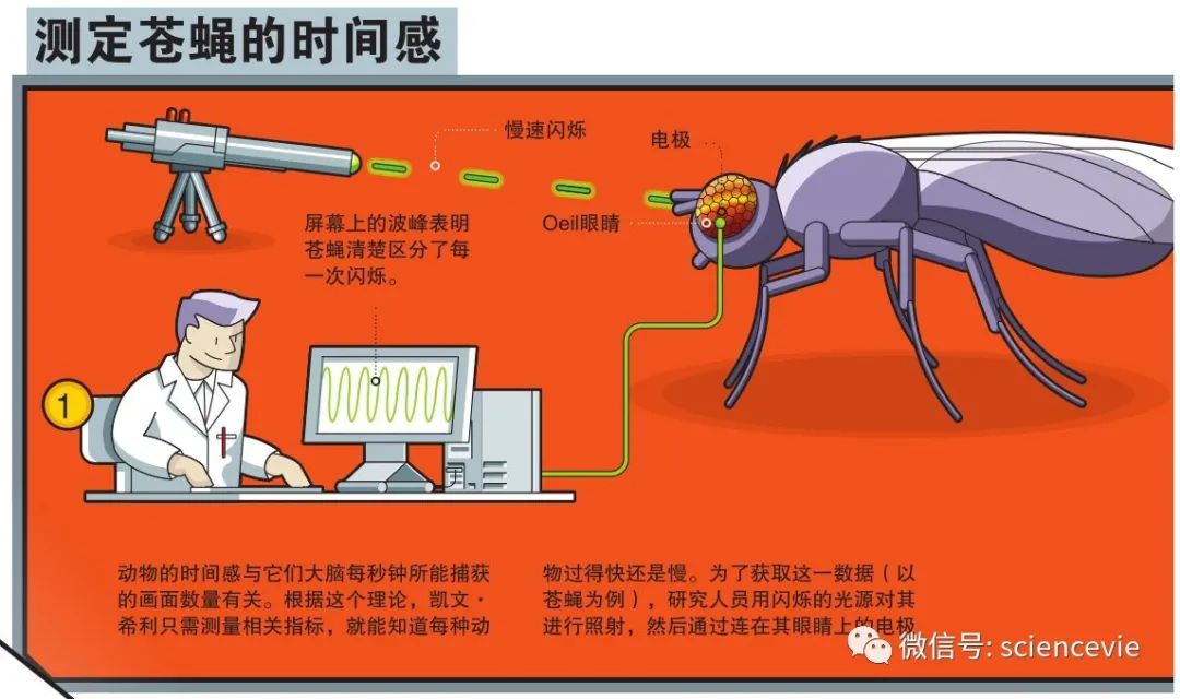 動物的時間感與(yu) 它們(men) 大腦每秒鍾所能捕獲的畫麵數量有關(guan) 。根據這個(ge) 理論,凱文·希利隻需測量相關(guan) 指標,就能知道每種動物過得快還是慢。為(wei) 了獲取這一數據(以蒼蠅為(wei) 例),研究人員用閃爍的光源對其進行照射,然後通過連在其眼睛上的電極