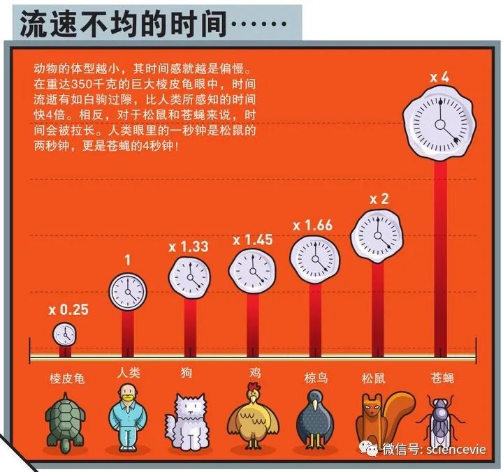 動物的體(ti) 型越小,其時間感就越是偏慢。在重達350千克的巨大棱皮龜眼中,時間流逝有如白駒過隙,比人類所感知的時間快4倍。相反,對於(yu) 鬆鼠和蒼蠅來說,時間會(hui) 被拉長。人類眼裏的一秒鍾是鬆鼠的兩(liang) 秒鍾,更是蒼蠅的4秒鍾!
