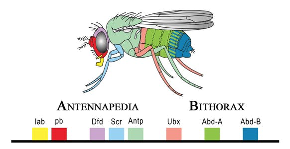 1990年,分子生物學家William McGinnis和他的研究小組想知道,一個(ge) 物種的Hox基因是否能在另一個(ge) 物種中具有類似的功能。他們(men) 進行了一項開創性的實驗,將小鼠和人類的Hox基因植入到果蠅之中,然後激活了身體(ti) 中的錯誤區域的基因,例如,在果蠅頭部的最前端放置指導了人類的腿應在哪裏發育的Hox基因。如果身體(ti) 部位出現錯位,則表明小鼠或人類的Hox基因的功能與(yu) 果蠅自身的基因一樣。