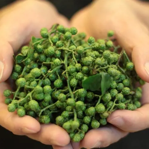 藤椒實際上是花椒屬中“竹葉花椒”的果實,學名為(wei) Zanthoxylum armatum。竹葉花椒枝葉披散,狀若藤蔓,故稱藤椒。藤椒顏色為(wei) 青綠色,曬幹後呈深黃綠色,氣味更加濃鬱,吃到嘴裏還有很重的麻感。