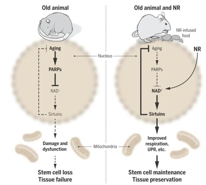 1 Zhang, Hongbo, et al. "NAD+ repletion improves mitochondrial and stem cell function and enhances life span in mice." Science 352.6292 (2016): 1436-1443.