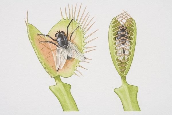 捕蠅草的每一片葉子頂部都有一個(ge) 貝殼狀的夾子,每個(ge) 夾子的邊緣都有一排粗長的齒。當夾子閉合後,這些齒會(hui) 交叉在一起,防止獵物逃出。每個(ge) 夾子的內(nei) 側(ce) 都有6根觸毛,每側(ce) 3根。當獵物第一次觸動某根觸毛時,夾子是不會(hui) 運動的。當第二次觸動這6根觸毛中的任何一根,夾子就會(hui) 在一秒內(nei) 迅速合攏。這時,夾子隻是鬆鬆地合著,夾子的兩(liang) 瓣之間還有一定空間,獵物甚至可以在裏麵來回走動。但獵物表麵的化學物質會(hui) 進一步刺激夾子在數小時內(nei) 逐漸夾緊,並分泌液體(ti) 使獵物窒息而死。