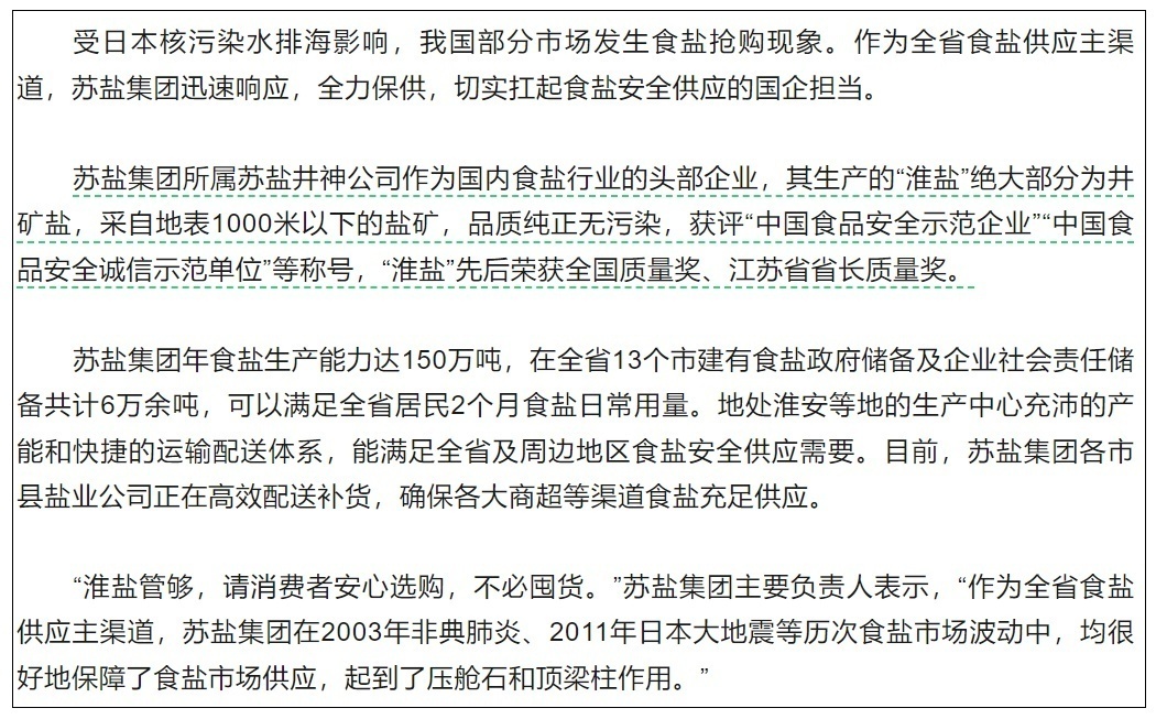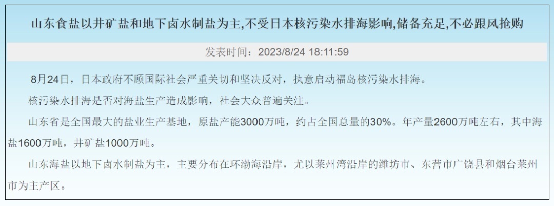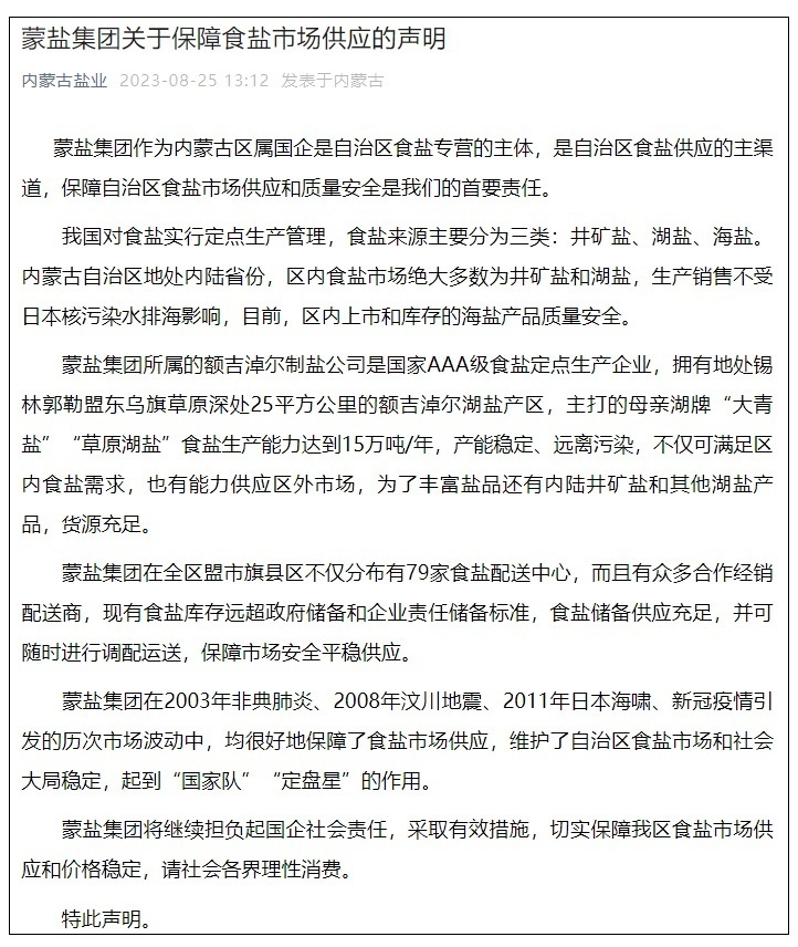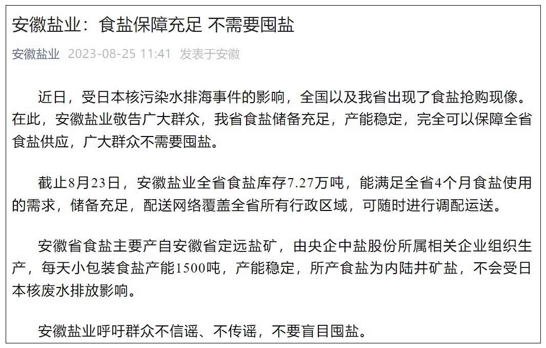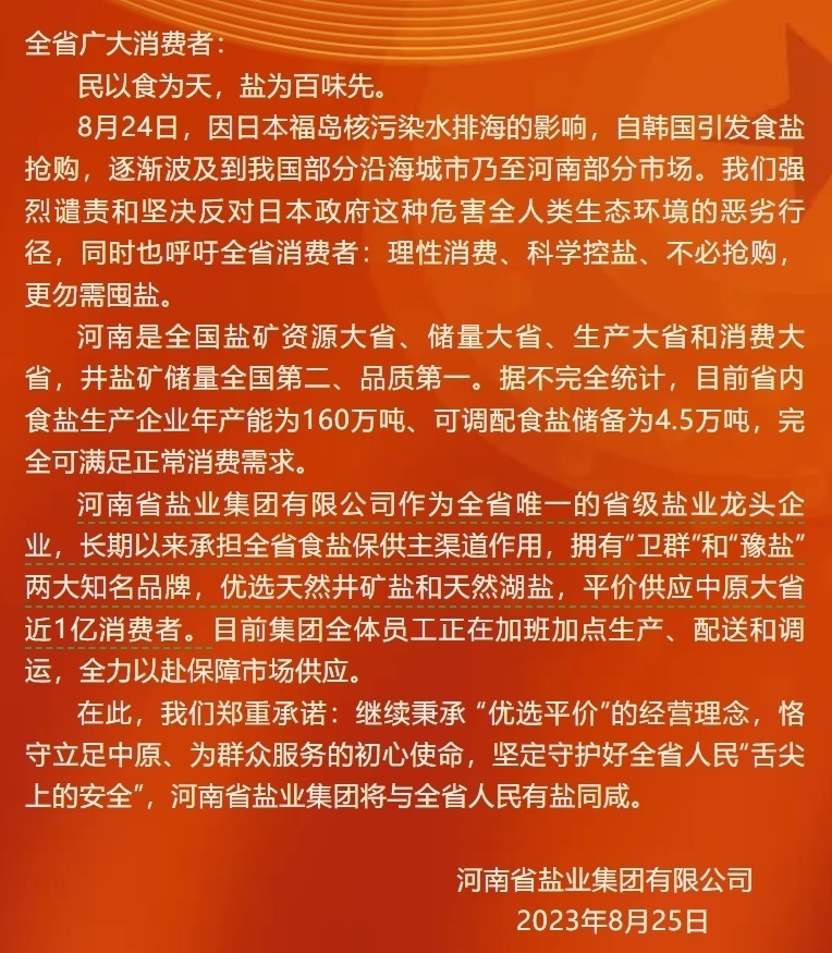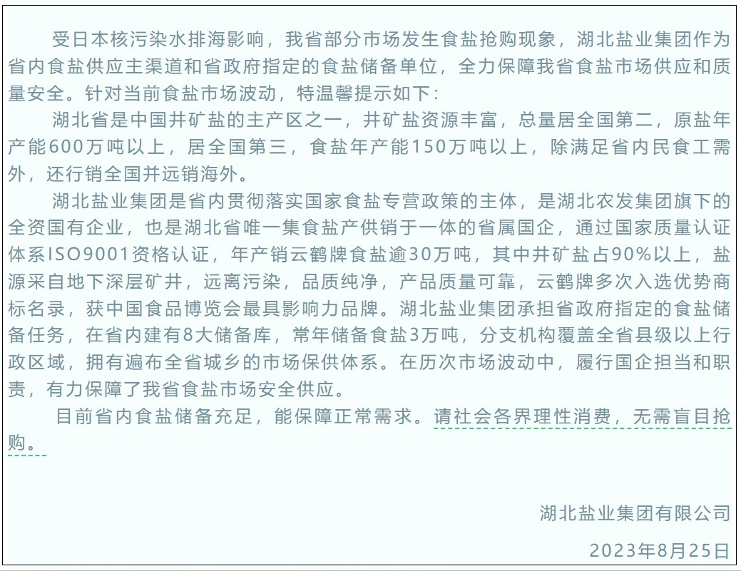 25日,安徽鹽業(ye) 集團發文表示,安徽省食鹽儲(chu) 備充足,產(chan) 能穩定,完全可以保障全省食鹽供應,廣大群眾(zhong) 不需要囤鹽。截至8月23日,安徽鹽業(ye) 全省食鹽庫存7.27萬(wan) 噸,能滿足全省4個(ge) 月食鹽使用的需求,儲(chu) 備充足,配送網絡覆蓋全省所有行政區域,可隨時進行調配運送。安徽省食鹽主要產(chan) 自安徽省定遠鹽礦,由央企中鹽股份所屬相關(guan) 企業(ye) 組織生產(chan) ,每天小包裝食鹽產(chan) 能1500噸,產(chan) 能穩定,所產(chan) 食鹽為(wei) 內(nei) 陸井礦鹽,不會(hui) 受日本核廢水排放影響。