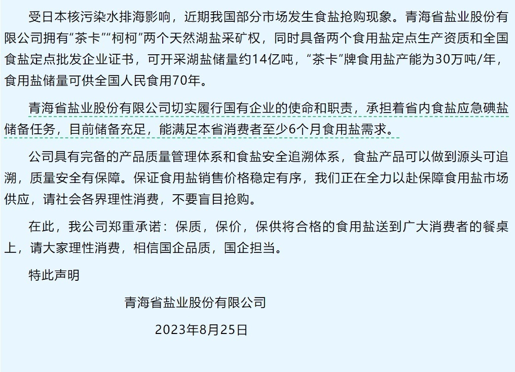 8月25日,青海省鹽業(ye) 股份有限公司發布聲明稱,該公司擁有“茶卡”“柯柯”兩(liang) 個(ge) 天然湖鹽采礦權,同時具備兩(liang) 個(ge) 食用鹽定點生產(chan) 資質和全國食鹽定點批發企業(ye) 證書(shu) ,可開采湖鹽儲(chu) 量約14億(yi) 噸,“茶卡”牌食用鹽產(chan) 能為(wei) 30萬(wan) 噸/年,食用鹽儲(chu) 量可供全國人民食用70年。