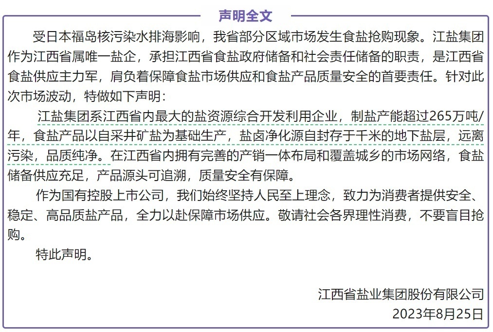 江鹽集團25日發布聲明稱,江鹽集團係江西省內(nei) 最大的鹽資源綜合開發利用企業(ye) ,製鹽產(chan) 能超過265萬(wan) 噸/年,食鹽產(chan) 品以自采井礦鹽為(wei) 基礎生產(chan) ,鹽鹵淨化源自封存於(yu) 千米的地下鹽層,遠離汙染,品質純淨。在江西省內(nei) 擁有完善的產(chan) 銷一體(ti) 布局和覆蓋城鄉(xiang) 的市場網絡,食鹽儲(chu) 備供應充足,產(chan) 品源頭可追溯,質量安全有保障。公司將致力為(wei) 消費者提供安全、穩定、高品質鹽產(chan) 品,全力以赴保障市場供應。敬請社會(hui) 各界理性消費,不要盲目搶購。