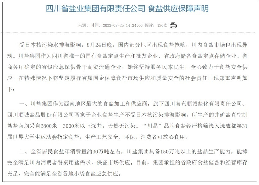 25日,四川省鹽業(ye) 集團有限責任公司發布食鹽供應保障聲明:川鹽集團作為(wei) 西南地區最大的食鹽加工和供應商,旗下四川南充順城鹽化有限責任公司、四川順城鹽品股份有限公司兩(liang) 家子企業(ye) 食鹽生產(chan) 不受日本核汙染排海影響,所生產(chan) 的井礦鹽真空製鹽鹽鹵均采自2800米—3000米以下深井,天然無汙染。四川全省居民食鹽年消費量約30萬(wan) 噸左右,川鹽集團具備150萬(wan) 噸以上的鹽品生產(chan) 能力,能夠完全滿足川內(nei) 消費者餐桌用鹽需求,保證市場供應。