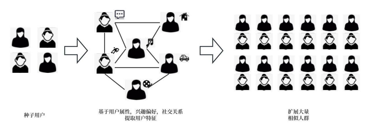 Lookalike技術,即相似人群擴展技術,是一種從(cong) 小規模的目標用戶群體(ti) 中,通過算法模型找到更大規模相似用戶群體(ti) 的方法。其核心思路是首先根據一小部分目標用戶(種子用戶)的特征,比如人口統計學數據、網絡行為(wei) 、消費偏好等,建立這部分目標用戶的畫像。然後,在更大範圍的用戶總體(ti) 中,找到與(yu) 這些目標用戶較為(wei) 相似的用戶。這些新找到的用戶就是目標用戶的“相似”群體(ti) 。