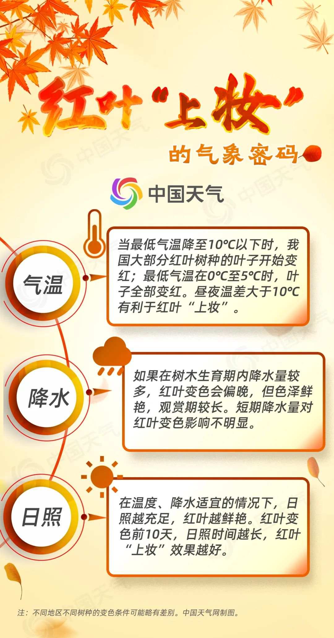 “氣溫、降水和日照,都會(hui) 直接影響紅葉‘上妝’的進程和效果。”中國天氣網氣象分析師王偉(wei) 躍表示,一般來講,當最低氣溫降至10℃以下時,我國大部分紅葉樹種的葉子就會(hui) 開始變紅;最低氣溫在0℃至5℃時,葉子會(hui) 全部變紅。此外,晝夜溫差大於(yu) 10℃也有利於(yu) 紅葉“上妝”。