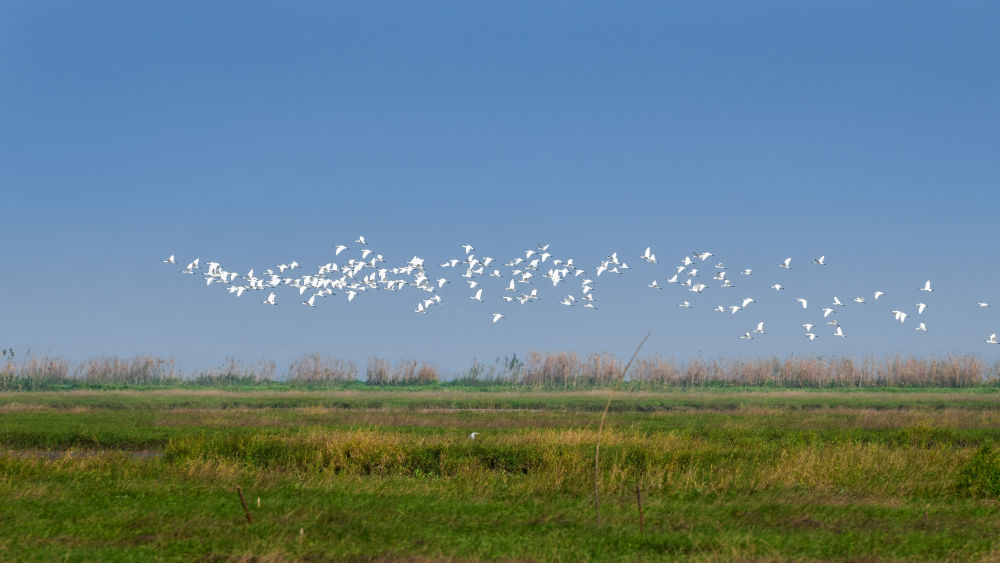 金秋暖陽下,橫嶺湖省級自然保護區內(nei) ,碧水映藍天,蘆葦隨風搖曳,遠處洲灘上,一群野鴨正在悠閑覓食,三三兩(liang) 兩(liang) 的白琵鷺在棲息,幾隻豆雁從(cong) 草叢(cong) 裏展翅飛出,靜謐多日的濕地變得熱鬧起來。