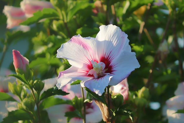 木槿花為(wei) 錦葵科木槿樹灌木,夏季開花,一直到秋末。木槿樹上的花瓣長長寬寬,毫不吝嗇地張開,猶如老式留聲機上的大喇叭。花瓣是淺淺的粉色,而花瓣底端又浸染成鮮紅,五片花瓣構成勻稱的五星,鮮紅的花底也隨之呈紅五星。仔細一看,鮮紅五星間還有一個(ge) 纖細翠綠的五星,三層三色五星相疊成趣。