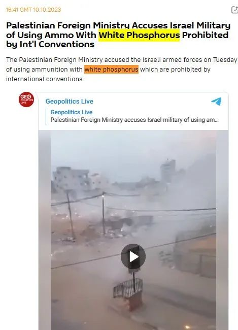 [1] Palestinian Foreign Ministry Accuses Israel Military of Using Ammo With White Phosphorus Prohibited by Int'l Conventions. Sputnik. October 10 2023 [2023-10-10]