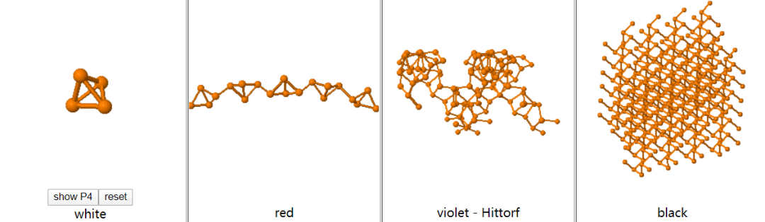 從(cong) 左到右依次為(wei) 白磷、紅磷、紫磷和黑磷的結構圖。其中,白磷的結構比較典型,是一個(ge) 正四麵體(ti) ,每個(ge) 頂點是一個(ge) 磷