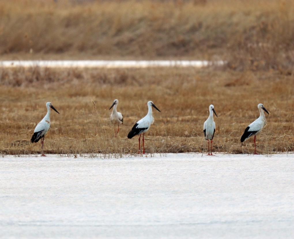 幾隻東(dong) 方白鸛在查幹湖岸邊休息(2020年3月22日攝)。新華社發