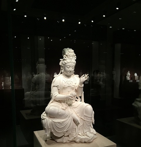 德化白瓷以瓷塑著稱,造型剛勁又不失細膩,釉色白淨如玉,備受讚譽。明末清初周亮工《閩山記》:“色瑩白,式亦精好,但累百枝,無一二合調者,合則聲淒朗,遠出竹上。”《泉州府誌》:“善塑瓷像,為(wei) 僧伽、大士,天下共寶之。”
