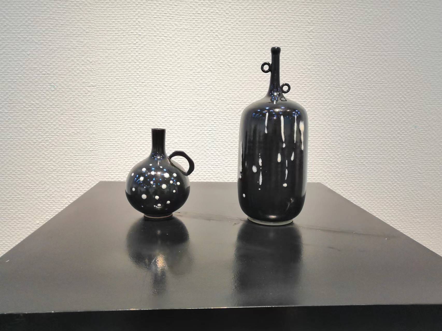 魯山花瓷采用灑彩或立粉堆線法在黑釉上施以帶藍色的釉料,經高溫窯變後,呈現天藍色或月白色塊狀彩斑。其藝術特色是在黑釉、黃釉、月白、天藍釉或茶葉末釉等上麵飾以月白、天藍或黑色斑塊,多少不等,或規整,或飄逸。這種高溫釉上的彩斑是用與(yu) 底色不同的釉料隨意點、刷、灑上的,有的是有規則的排列,有的紋樣不定型,燒成後自然流淌、變化多端。由於(yu) 多裝飾在深色釉上,襯托出來的色彩斑塊對比強烈、格外醒目,使整個(ge) 器物表現出大氣、莊重、堅定和鮮明,展現了大唐色彩斑斕的世界,以及熱烈明豔的特點。