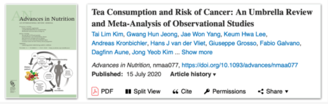 [2]Kim TL, Jeong et al. Tea Consumption and Risk of Cancer: An Umbrella Review and Meta-Analysis of Observational Studies. Adv Nutr. 2020 Nov 16;11(6):1437-1452.