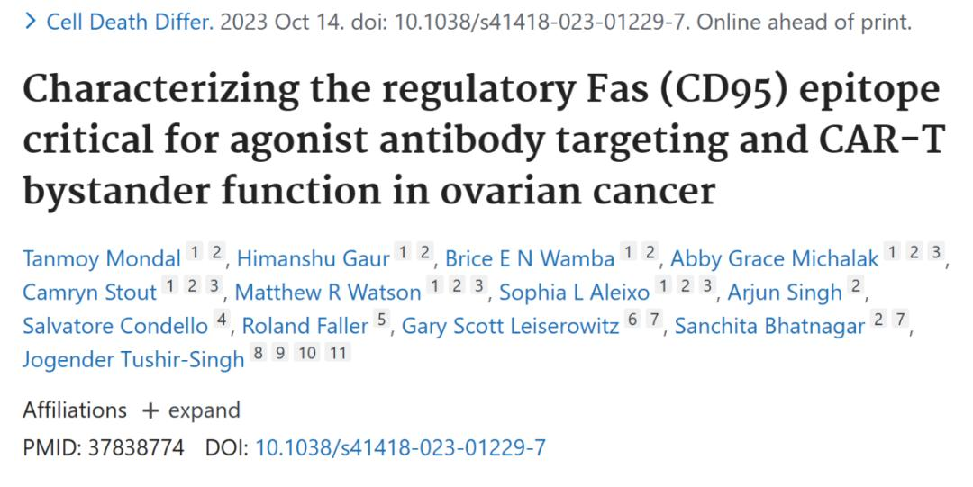 [1]Mondal T, Gaur H, Wamba BEN, Michalak AG, Stout C, Watson MR, Aleixo SL, Singh A, Condello S, Faller R, Leiserowitz GS, Bhatnagar S, Tushir-Singh J. Characterizing the regulatory Fas (CD95) epitope critical for agonist antibody targeting and CAR-T bystander function in ovarian cancer. Cell Death Differ. 2023 Oct 14. doi: 10.1038/s41418-023-01229-7. Epub ahead of print. PMID: 37838774.