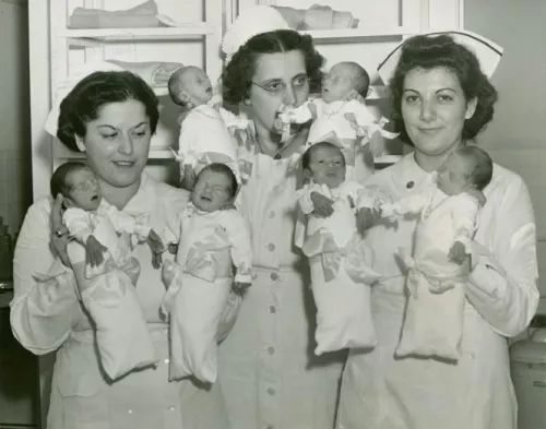 1939 年的紐約世博會(hui) ,護士展示 3 對雙胞胎,中間的護士是庫內(nei) 的女兒(er) 。圖片來源:Dr. Moe Goldstein
